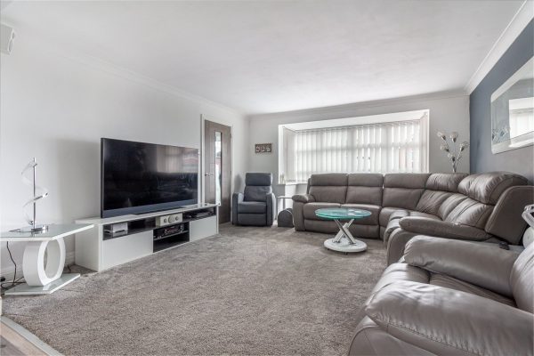 A bright and spacious living room, accessed via double doors from the dining area and entrance hall, completes the ground floor accommodation.