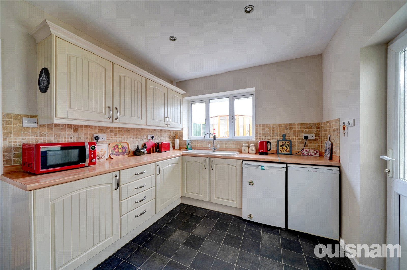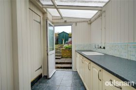 * Kitchen is fitted, with spaces for appliances. Door leads to a utility room with further units,