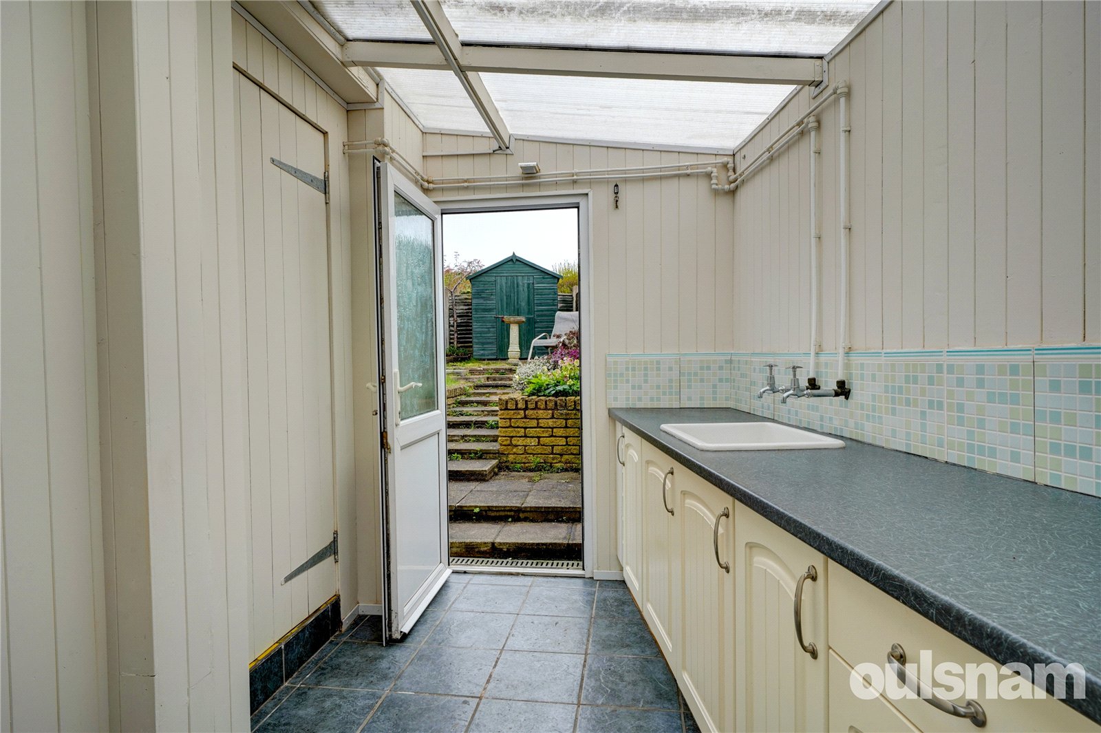 including a spacious cupboard which offers stacking for a washing machine and a tumble dryer, a sink and door to the rear garden and to the garage.