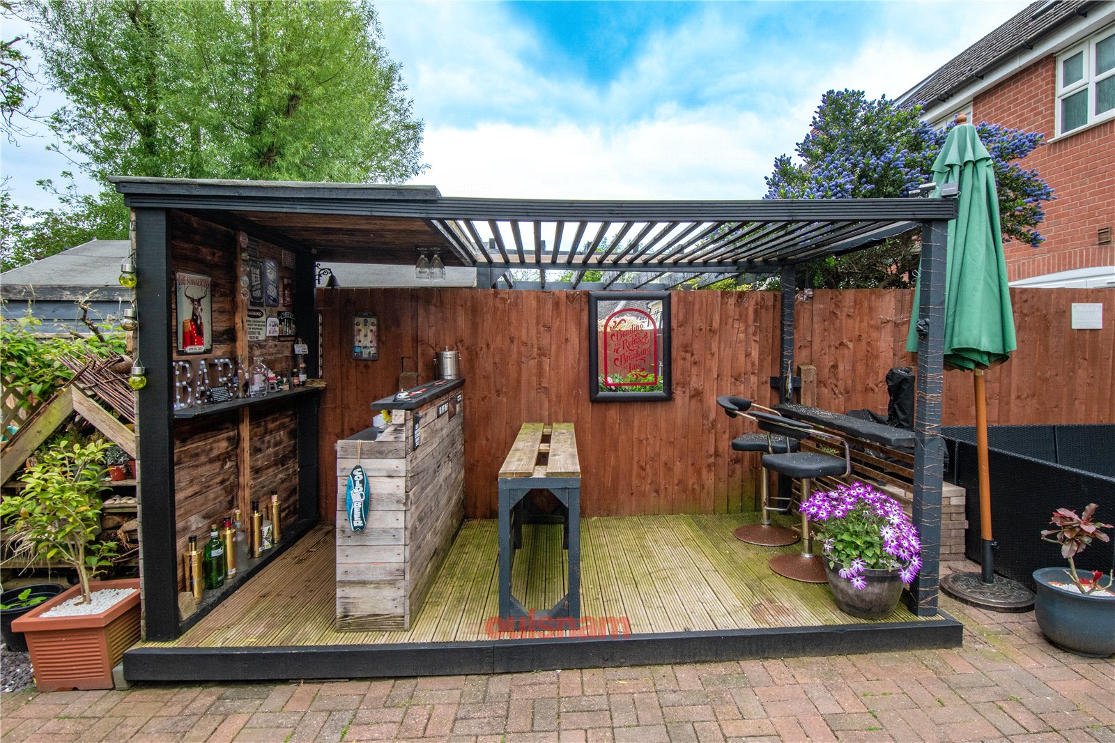 * Rear garden which has a patio area, a turfed lawn and a timber framed seating area and bar. There is a gate leading to a driveway providing off road parking with double gates opening out to the rear of the property. To the side of the property there is a timber lean-to which leads out to the front of the property