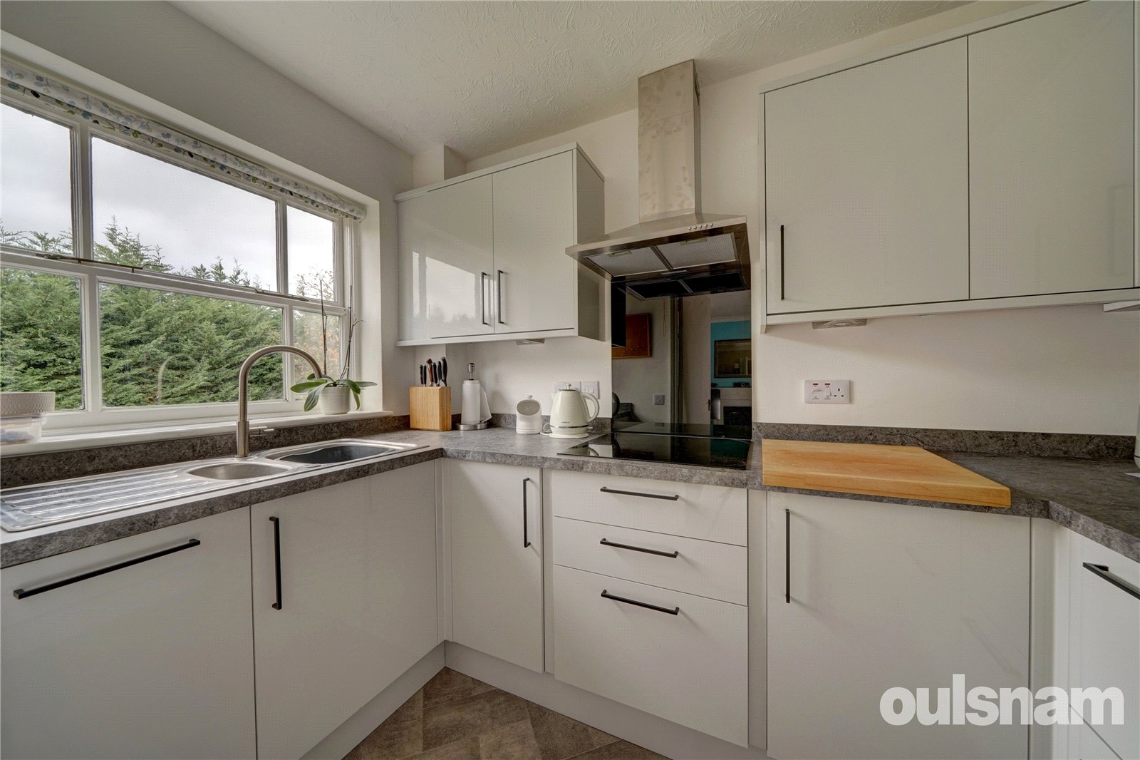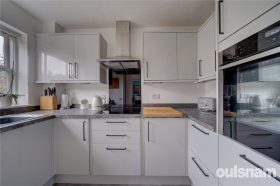 * Kitchen overlooks the communal gardens and is fitted with wall mounted and base units with integral oven, electric hob with extractor above and dishwasher