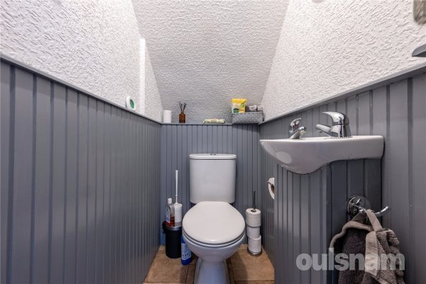 W.C which has a low level toilet, a wash hand basin and a window looking out to the side.