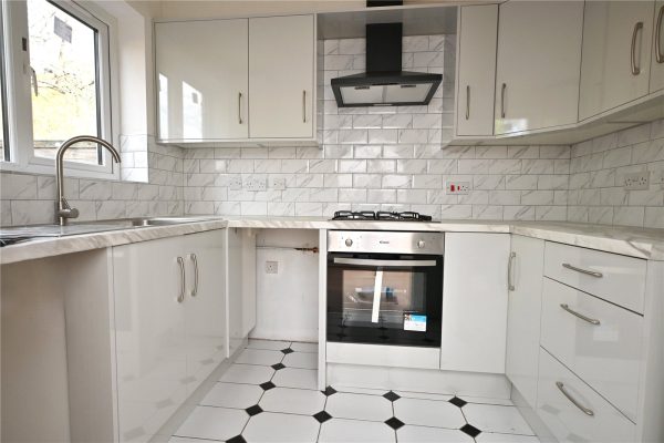 * The kitchen is fitted with a range of base cupboards and matching wall-mounted units, providing ample storage and worktop space for everyday use. There is designated space for white goods, ensuring practicality and convenience. A rear door offers direct access to the garden, allowing for easy indoor-outdoor living and plenty of natural light throughout the space.